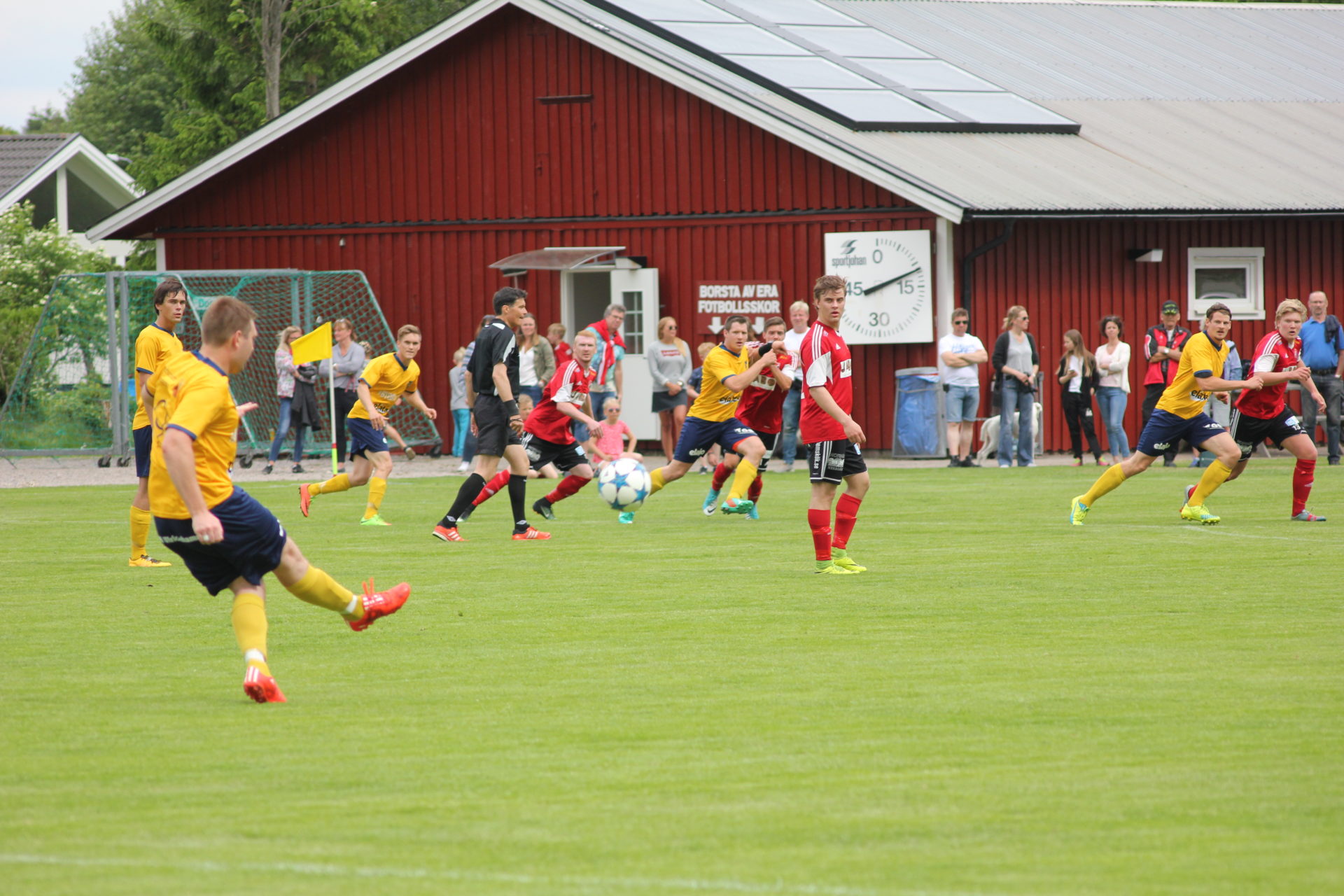 Att Länghem var taggat gick inte att ta miste på; de smällde på i närkamperna och kämpade på framåt. Månstad försökte spela boll, men hittade inte riktigt rätt. För att summera första halvlek så var det stolpe ut, först bokstavligt med en stolpträff från Länghem efter åtta minuter, därefter metaforiskt för Månstad: Skott utanför när Daniel M fyllde på i anfallet i minut 20, misslyckad inspark i minut 30, som serverade Länghem en målchans på silverfat (dock inget mål), Mackan J gick som en kniv i varmt smör genom länghemsförsvaret i minut 38, men blev stoppad innan han hann till avslut, o.s.v. Helt åt pepparn gick det dock inte innan Alexander Paulsson satte 1-0 till Länghem i 44:e minuten.